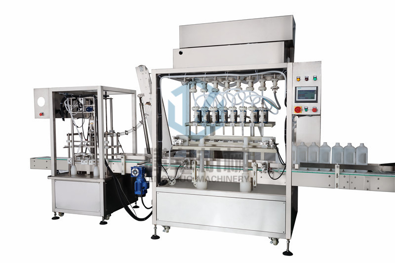 1.全自動生產線流程:人工把瓶放輸送帶上-自動灌裝-自動理蓋下蓋-自動旋蓋-人工收瓶