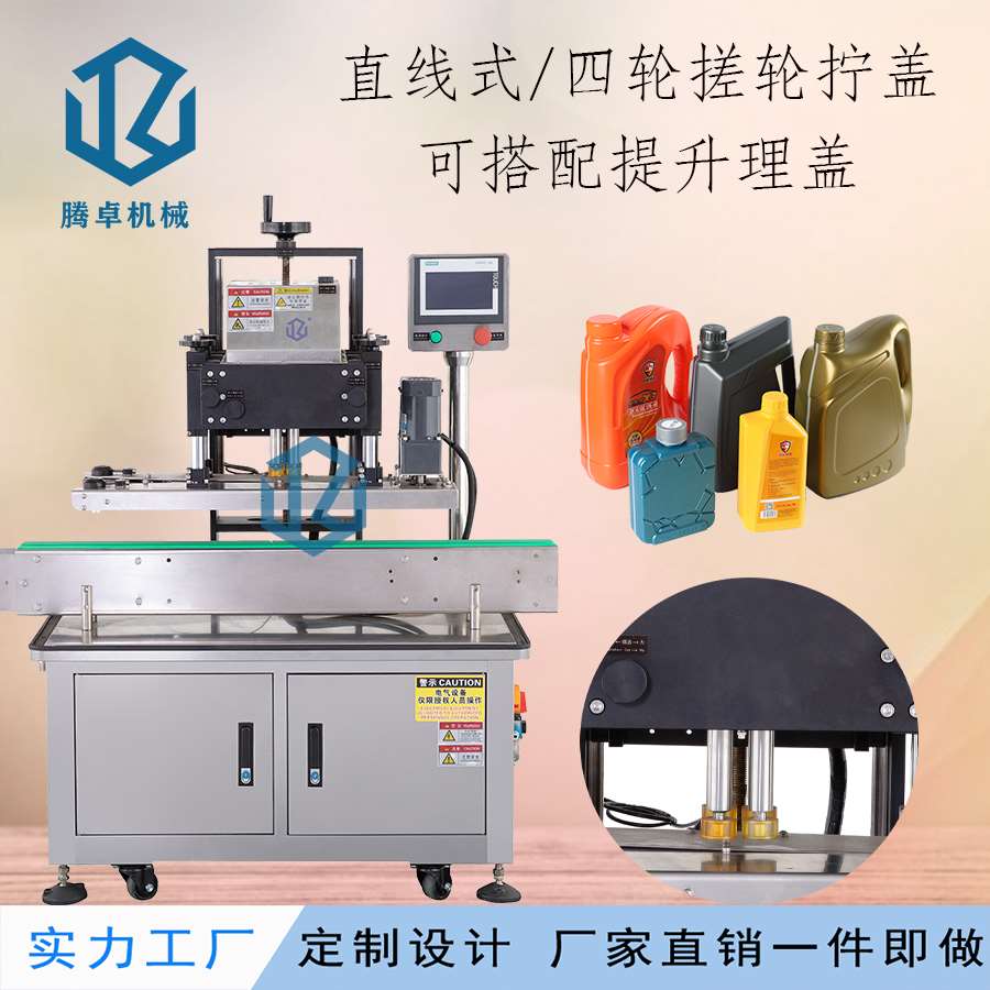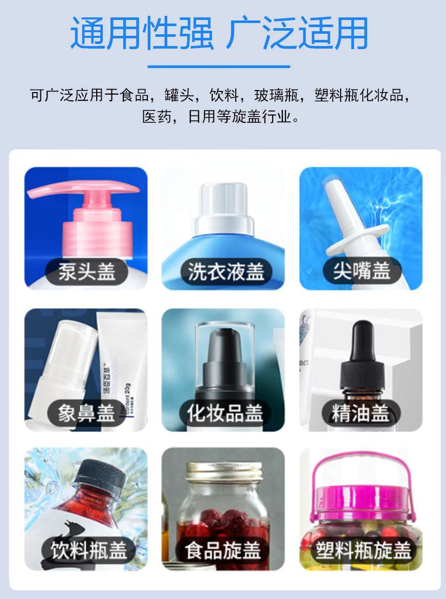 本機(jī)主要適用于螺絲紋平頭塑料蓋旋蓋擰緊,例:潤(rùn)滑油桶、礦泉水瓶、藥瓶、日化用品、飲料瓶等。調(diào)節(jié)簡(jiǎn)單,使用方便。可兼容多種瓶子蓋子。
