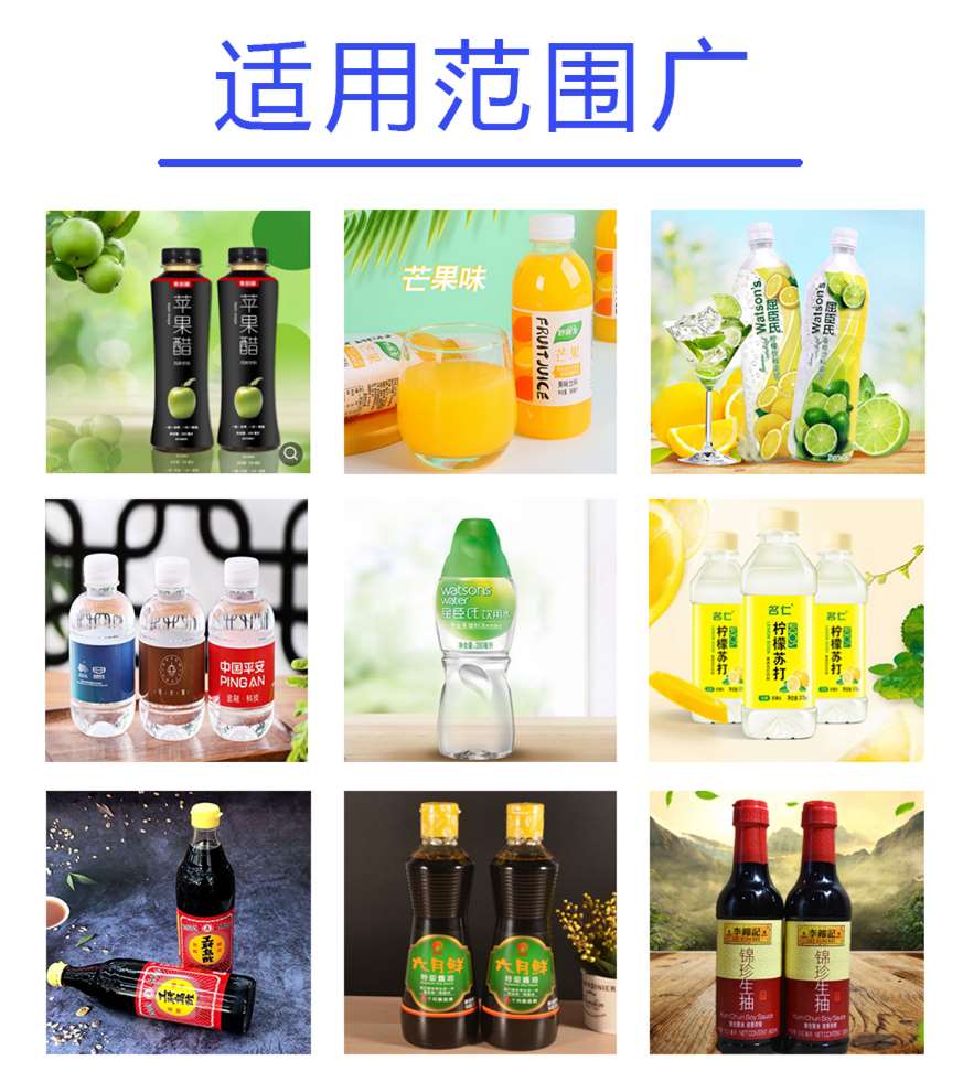 此生產線主要應用于食品廠,酒廠,日化廠,化工廠,汽車用品等行業。例如:各種酒類,醋,醬油,飲料,水,剎車油,汽油添加劑等,設備采用先進的光、電、氣一體化自動控制系統,實現進瓶,定位,灌裝,出瓶自動化生產。